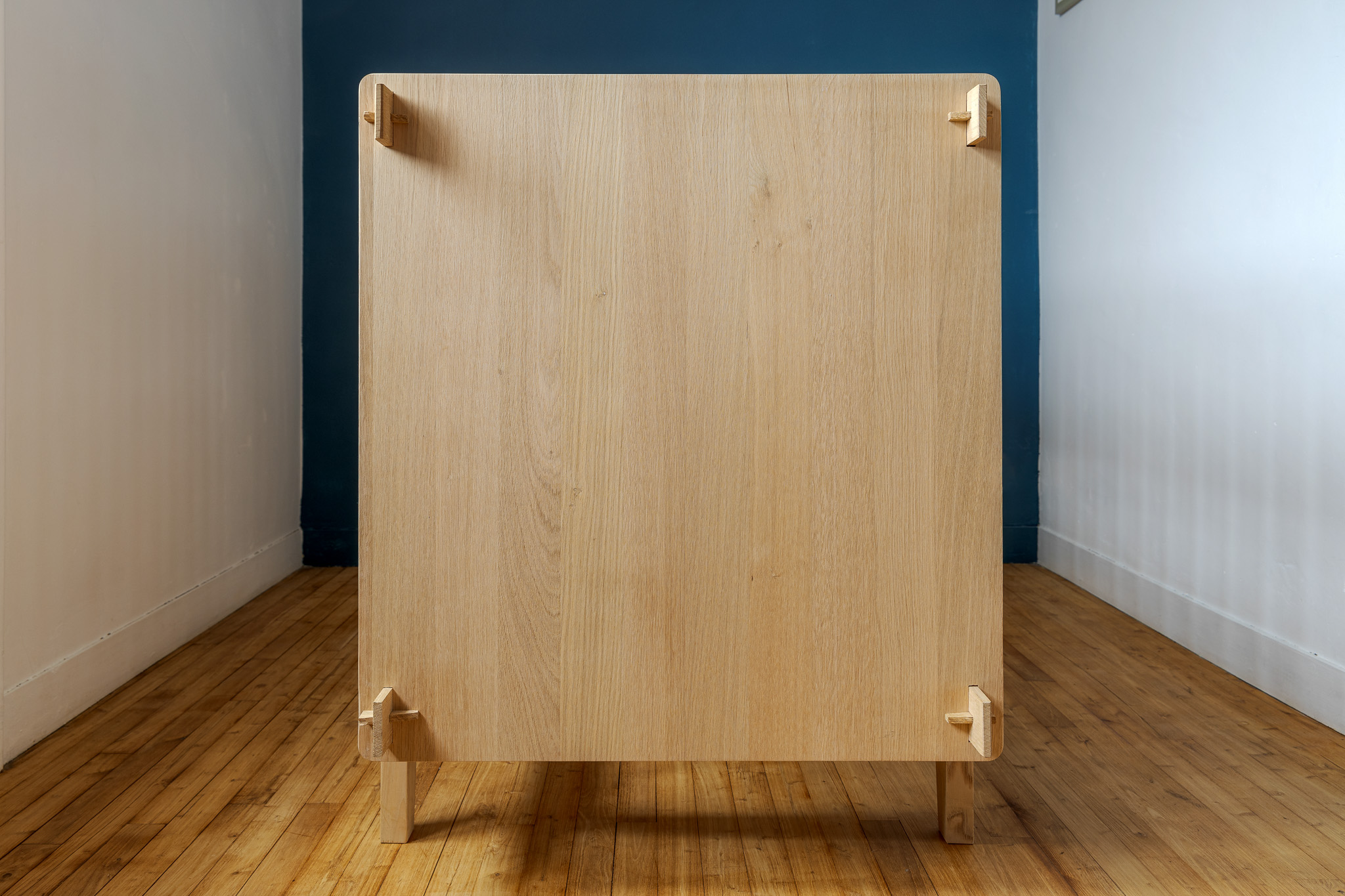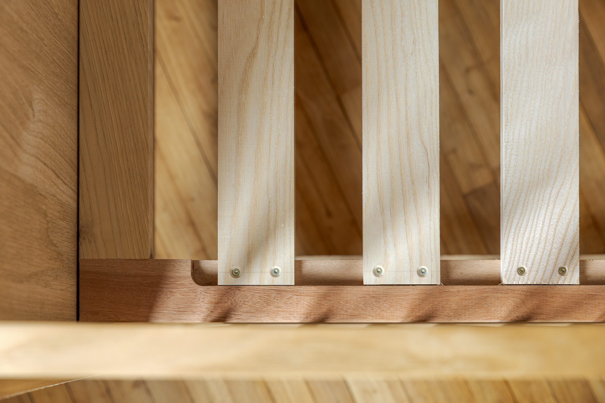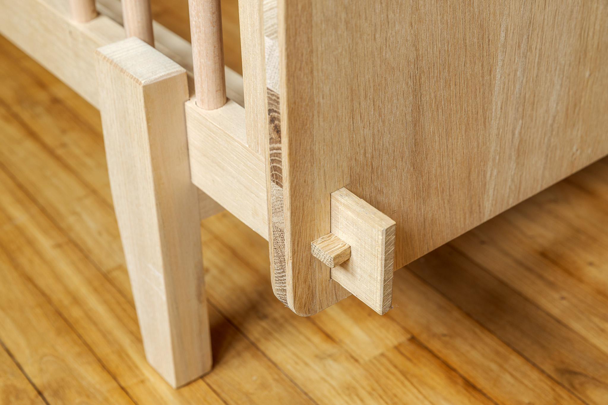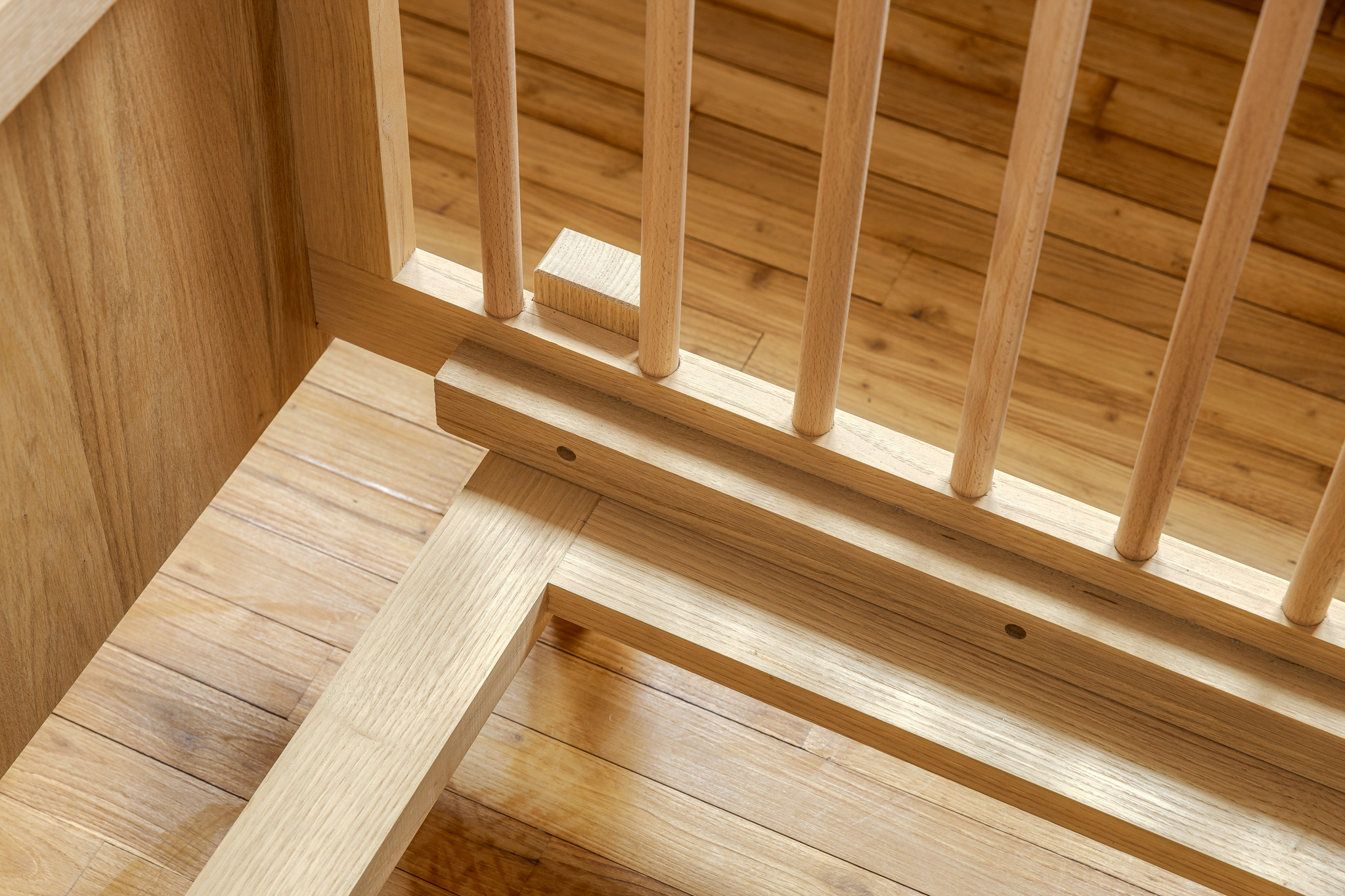 Il est entièrement fabriqué en bois massif à partir d’essences locales (structure en châtaignier, panneaux en chêne, sommier en frêne).
